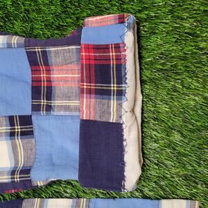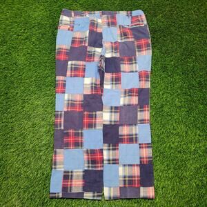 Vintage 70s Patchwork Plaid Pants 39x29.5 High Rise Straight Leg Hippie Boho Scovill Zipper Flat-Front Slacks Snap Closure Trousers Plaid Madras Tartan Multi-Patter Cotton Poly Blue Red Navy White Made In USA