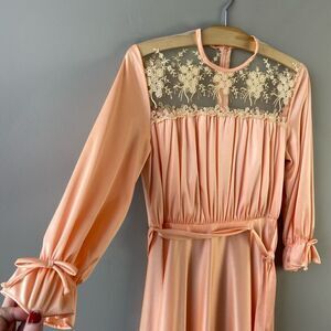 Vintage 1970s peach–apricot maxi dress with dreamy retro details and a versatile look. The gown features sheer lace panels across the front and back yoke, a ruched bodice that provides extra room at the bust, and ¾ sleeves finished with ruffled elastic cuffs and bow ties. A matching fabric belt cinches the waist, while the skirt flows into a full A-line silhouette. Back closure is a 22" metal zipper. Union label, made in the USA.