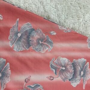 Vtg 1970s long sleeved dress with cuffed sleeves and notched collar. Peachy pink, with grey blue flowers in watercolor fashion. Has attached belt, to cinch waist, and lots of stretch. Hem is long enough to let out should you need more length. There is no tag, but this one is from my private collection of vintage dresses, and fit me well. I would say Medium would be best fit, but there is a belt to adjust waist size, and nice amount of stretch- so probs could go small or large too.