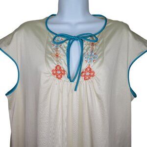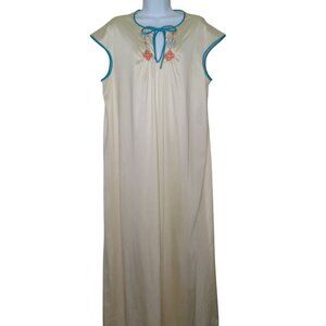 Vintage 70s Peignoir Set Full Length Nylon Nightgown Robe L Embroidery Blue Trim