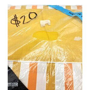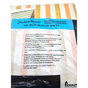 This Penn-Prest Fashion Manor no-iron muslin twin bed flat sheet combines 50% Fortrel polyester and 50% cotton for effortless maintenance. Designed for easy care, it eliminates the need for ironing. Its fresh look is retained even after washing and drying, while its construction ensures durability and comfort. The sheet is unused but there are holes and writing on the packaging. The colors are orange, white, and a harvest gold or similar.