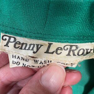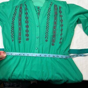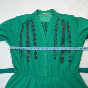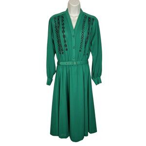 Vintage 70s Penny LeRoy Block Printed Dress Belted Knee Length Green Medium