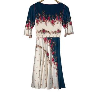 • Vintage teal and pink floral printed dress with knife pleated bodice