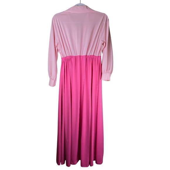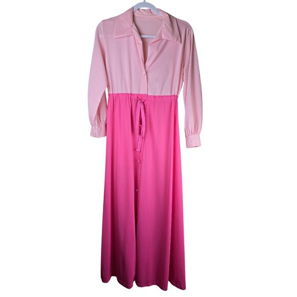 Vintage 70s Pink Long-Sleeve Button-Up Maxi Dress W/ Drawstring Waist