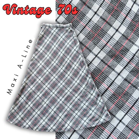 Red, White, Black Vintage 70s Plaid Tartan A-Line Maxi Skirt