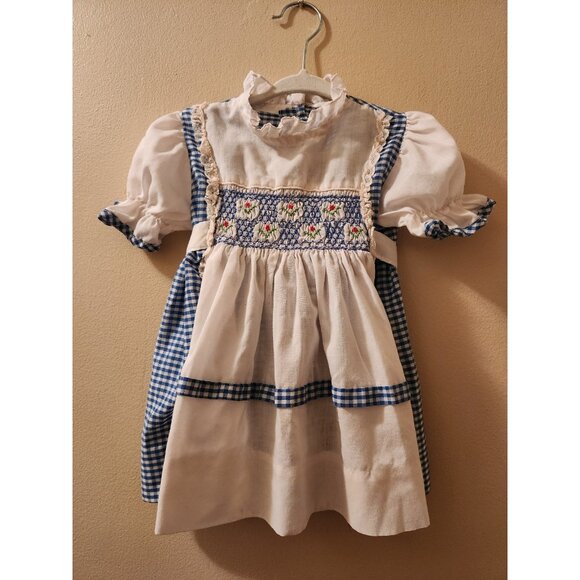 Vintage 70s Polly Flinders Handsmocked Blue & White Dress Girls Size T2