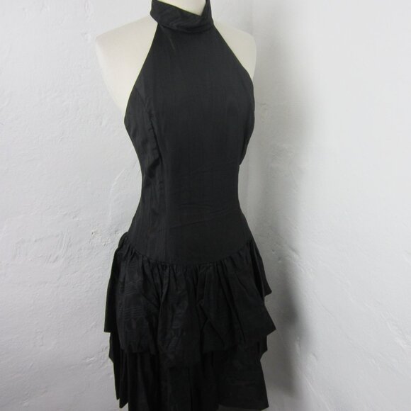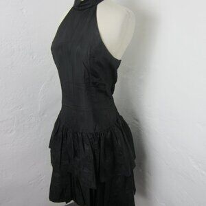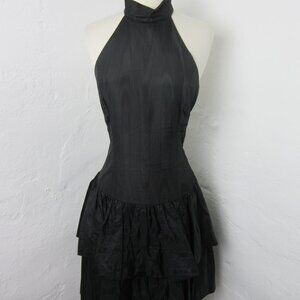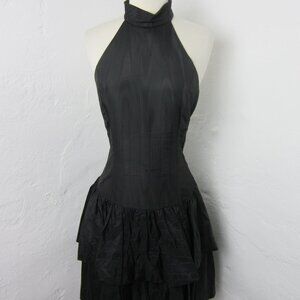 Vintage 70s Positively Ellen Black Taffeta Drop Waist Collared Neck Sleevess Tiered Dress
