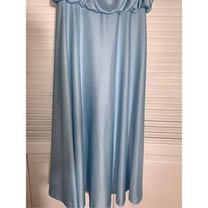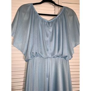 Vintage 70’s Powder Blue Chiffon Dress Small USA. Debbi Bee soft jersey polyester Dress. 70’s does 30’s. Baby blue pastel. Long zipper back. Puckered pleated waist no stretch. Flowy material cut out shoulder. Double layered top single layer bottom. Excellent vintage condition. No flaws noted. Faded size label. Please see measurements below.