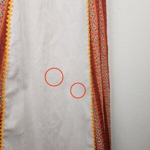 Off white/ivory with maroon, gold, and green