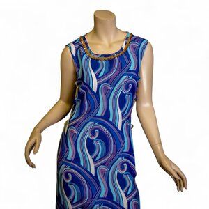 This one-of-a-kind handmade maxi dress from the 1970s features a bold psychedelic swirl print in blue, purple, and teal. The sleeveless design has a scoop neckline trimmed with gold sequins, and the sides lace up with gold cord ties, giving it an adjustable fit.
