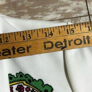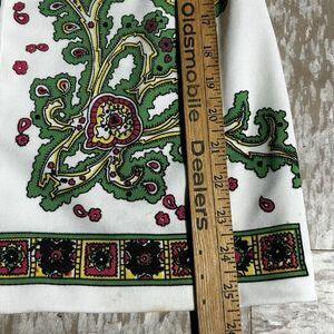 1970s Bradley polyester tunic featuring an eye-catching psychedelic print in green, red, yellow, and black on a white background. Both front and back carry bold swirling paisley motifs with a striking mandala-style design on the back. Button-down front with a sharp pointed collar and short sleeves trimmed with printed bands. Fabric: 100% polyester. Note: stain near back hem (see photo).