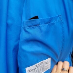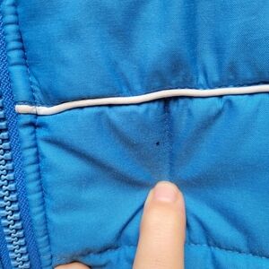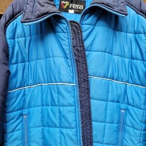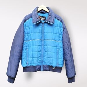 Vintage 1970s blue puffer ski jacket with color blocking.