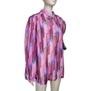 Beautiful vintage 1970's Lady Winn California by Teddi purple semi-sheer chiffon chevron diamond print blouse, pussybow, puff balloon sleeves, size is marked 46 but fits a modern M/L/XL/1X/2X depending on your measurements and desired fit, model is a size M/6 for reference.