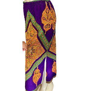 A great bohemian skirt that features quilted fabric in purple, orange, and green, and slits on both sides. Elastic waist.