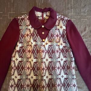 Vintage 70s R&K Knits polyester geometric patterned wine red and gray midi dress. Double-knit polyester long sleeved shift dress with Peter Pan collar, gold metal buttons, and diamond shaped pattern. Zips up the back. Very good vintage condition with no flaws to note.