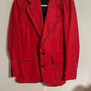 If you are going to a Disco Party - THIS IS IT !!!!! Or just a fun night on the town. This is a heavy Red Denim with Navy Blue Piping - in EXCELLENT condition! Denim is super soft. Worn twice. Pristine condition Two pockets on jacket front and one interior pocket. Size S - Measurements are: PTP 17", Jacket length 30" and Sleeves are 25".