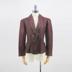 Red oxblood leather with a founded edge, rounded classic collar and button front.