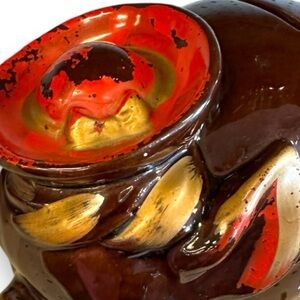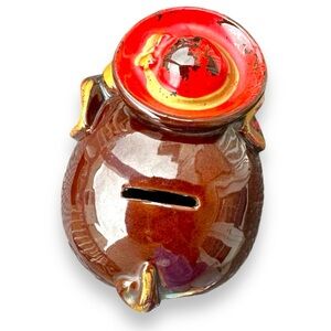 Very cute vintage 70s Japan Redware Japan dark brown ceramic piggy bank of a chubby pig with a red hat. Measures approx 6” H x 6” W. Preowned in good used vintage condition, light signs of wear typical of age - please see photos for best sense of condition.