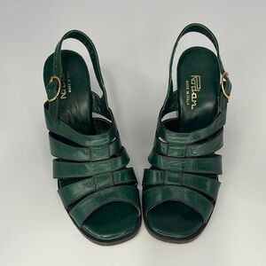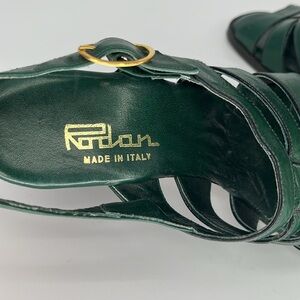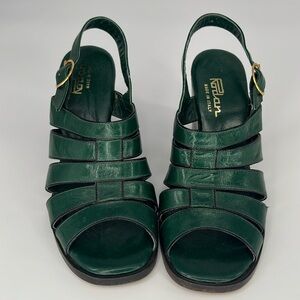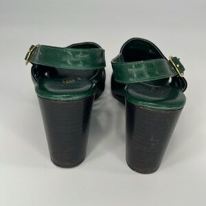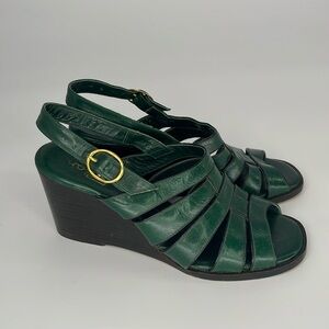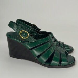 Vintage 70s Rodan Stacked Wedge Sandals in Green Leather Size 5 1/2