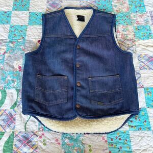 Vintage 70s Roebucks Sherpa Lined Dark Denim Vest Western Snap Button + Pockets