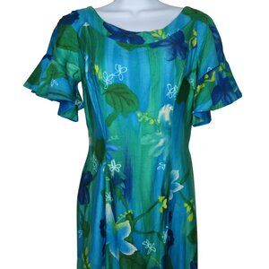 This maxi dress features a vibrant blue and green floral pattern, complemented by ruffle sleeves. Designed in Hawaii, it offers a timeless tropical elegance.
