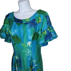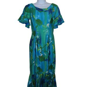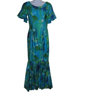 Vintage 70s Royal Hawaiian Blue Green Floral Maxi Mermaid Dress Ruffle Sleeves S
