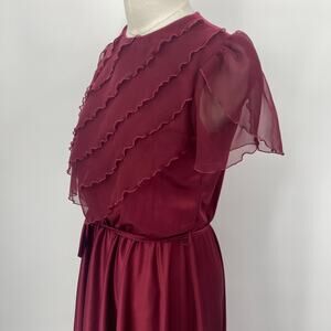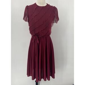 Keywords: 1970s seventies 60s sixties 1960s eighties 1980s 80s vtg retro burgundy wine deep red merlot sangria ruby jewel toned skater flattering flared skirt fluttery flirty romantic feminine dainty delicate ruffly ruffles mod casual vacation travel sundress summery lightweight round neck sophisticated elegant belted bow waist knee length satin chiffon