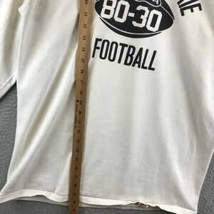 Vintage athletic tee, perfect for the football enthusiast or vintage sportswear collector. Features a classic V-neck design and long sleeves, making it suitable for layering or wearing on its own during cooler months. The front displays a bold graphic of a football with "80-30," along with the words "Blooming Prairie Football", adding a touch of vintage charm. This garment brings a sporty vibe to any casual ensemble. Ideal for weekend outings, casual gatherings, or adding a retro touch to a workout outfit.