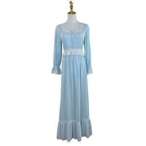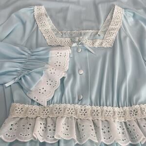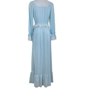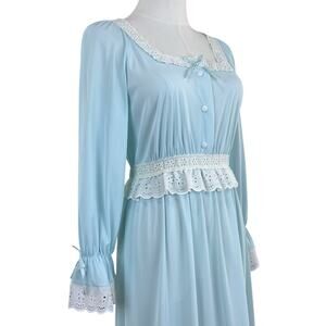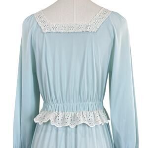 Vintage 70s SEARS Pastel Blue Nylon Eyelet Lace Trim Maxi Nightgown Size S