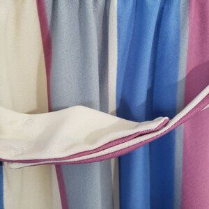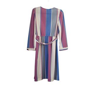 This vintage 1970s Sally's Girl dress embodies timeless elegance with its bold striped pattern in soft pastel hues. The flowing silhouette, accentuated by a fabric belt, combines both comfort and style from a bygone era. Its unique design captures the essence of retro fashion, perfect for collectors or vintage enthusiasts.
