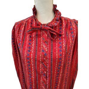 Vintage 70s Schrader Red Blue Floral Long Sleeve Maxi Dress XL Secretary Office
