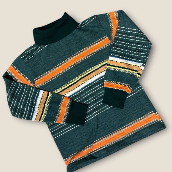 Classic Perma-Prest textured knit in forest green with orange, yellow, and white stripes. Mock turtleneck style. True 70s childrens vintage with that iconic Sears catalog look.