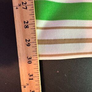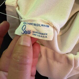 Step back in time with these vintage 70s Sears women's bell bottom pants. Made from white polyester, they feature striking green stripes around the ankles. Perfect for retro fashion lovers seeking a unique statement piece. A few small snags (see photos).