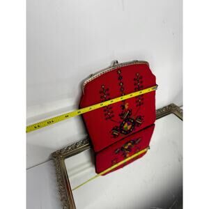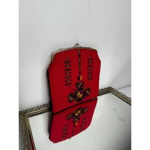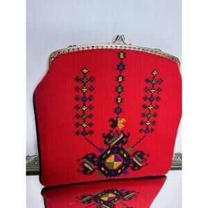 Vintage 70s Serbia Folkart Red Wool Embroidered Needlework Bag Metal Frame