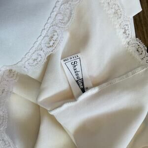 Vintage 70s Shadowline Cream Lace Lingerie Slip Dress. In a dreamy cream white hue, this slip dress is adorned with delicate lace detailing, adding a touch of romantic elegance. The adjustable straps ensure a perfect fit, while the soft and breathable 100% nylon fabric offers luxurious comfort. Made in the USA.