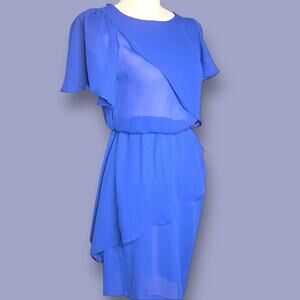 Vintage 70s Sheena Size XS Blue Sheer Chiffon Dress Ruffle Peplum Disco Career