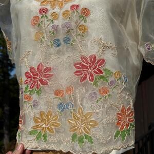 Vintage 70s Sheer Organza Peaked Puff Sleeve "Stained Glass" Boxy Cropped Blouse