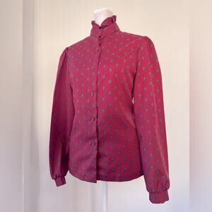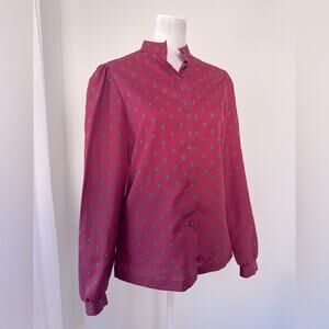 Cute vintage ‘70s burgundy printed blouse by Ship ‘n Shore, a historic fashion line known for its well-made, classic pieces (included some brand history in the photos!). The blouse has a unique collar that can be worn as a high neck, or unbuttoned / removed entirely (pictured both ways).
