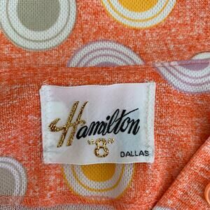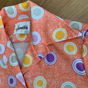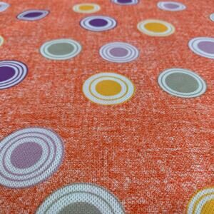 Orange with polka dots of purple, green, yellow, and gray or tan