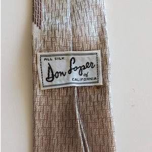 Really lovely vintage silk skinny tie from the 1970's. Tag reads "ALL SILK Don Loper of California". This brown and beige tie has an abstract print and has an almost iridescent quality because of the silk. A real stunner!