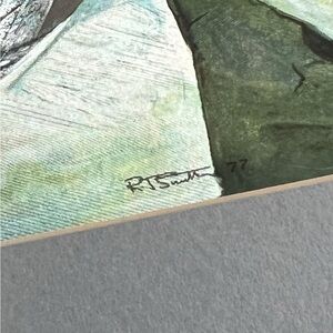 This 1970s signed and framed metallic foil print titled “Snowy Owl” by RJ Smith is a striking piece of vintage art. The print, dated 1977, features a majestic snowy owl rendered in shimmering metallic foil that shifts beautifully in tones of icy blue and silver as light catches it.