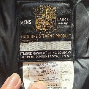 Vintage 1970s Stearns Mens Insulated Snowmobile Suit, size Large (4446). Made in St. Cloud, Minnesota, USA, this Genuine Stearns Product showcases classic 70s design and durable American-made construction.