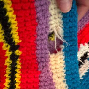 Add a pop of retro charm to your space with this vintage 70s Afghan throw blanket. Its vibrant multi-colored stripes bring warmth and style to any room, perfect for cozying up or as a decorative piece. Fair pre-owned condition. Pilling throughout with some holes (see photos), and it could use a wash.