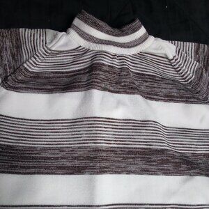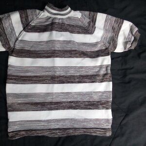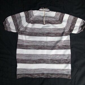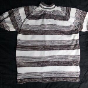 Vintage 70s Striped Polyester Short Sleeve Shirt - 100% Polyester - Size Medium (Estimate, No Size Tag), Measures p2p=18" Length=20" - Excellent Condition, No Flaws - White And Brown Color Shirt