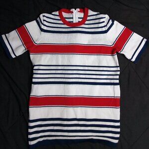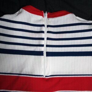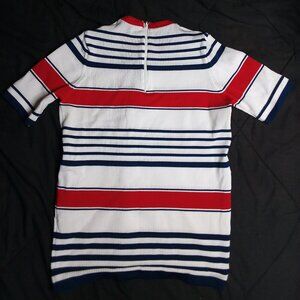 Vintage 70s Striped Ribbed Polyester Top Blouse T-Shirt - Zipper On Back (Pictured) - Size Medium (Estimate, No Size Tag), Measures p2p=18" Length=25" - Excellent Condition, No Flaws - White, Red, Blue Color Shirt