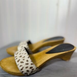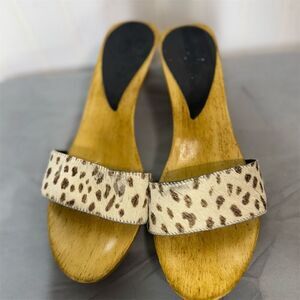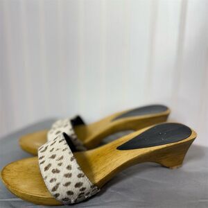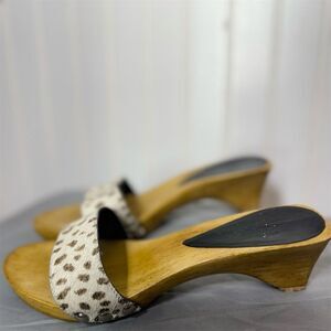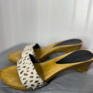 Vintage 70s Style Wood Platform Clogs Sandals Leopard Pony Hair Slip Ons 7 Boho