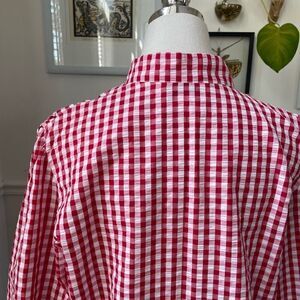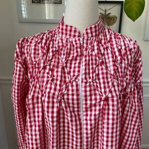 Vintage 70s Styled by Saybury Red Gingham half zip nightgown house coat. Made of polyester and cotton blend seersucker fabric in red and white. Half zip front. Pull over styling. There is a diamond pucker folding detail at the front yoke that is punctuated by fabric covered buttons that are decorative. Around the house or great for a little red riding hood grandma costume. It says small on the tag and somebody wrote an X in front of the small but it’s featured on my size small dress form for scale and it’s quite roomy. Lane flat measures 50 inches shoulder to him 24 inches armpit two armpits and 30 inches straight across the waist. No noted flaws
