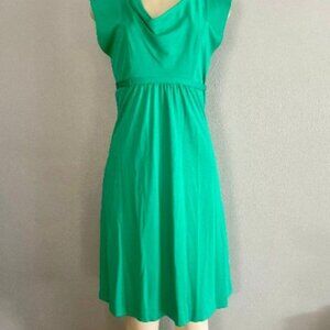 With an empire waist and cowl neckline, this dress features a deep emerald green color and an attached belt that ties at the back. With back zipper.