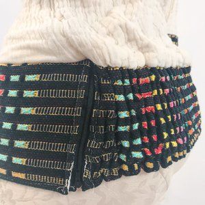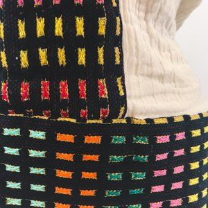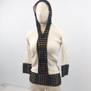 Ivory vtg boho black fall/winter mid-weight cotton gauze blouse w hood & long sleeves. stretchy, woven, comfortable. traditional Ethiopian style w detail ruching, geometric metallic gold threads, stripes, w elastic sides. fab for everyday, beach. GUC