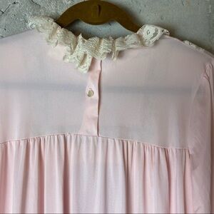 Vintage 1970s Suzy star long floor length nightgown in baby doll pink nylon with Victorian inspired cream colored lace bodice and wrist cuff details